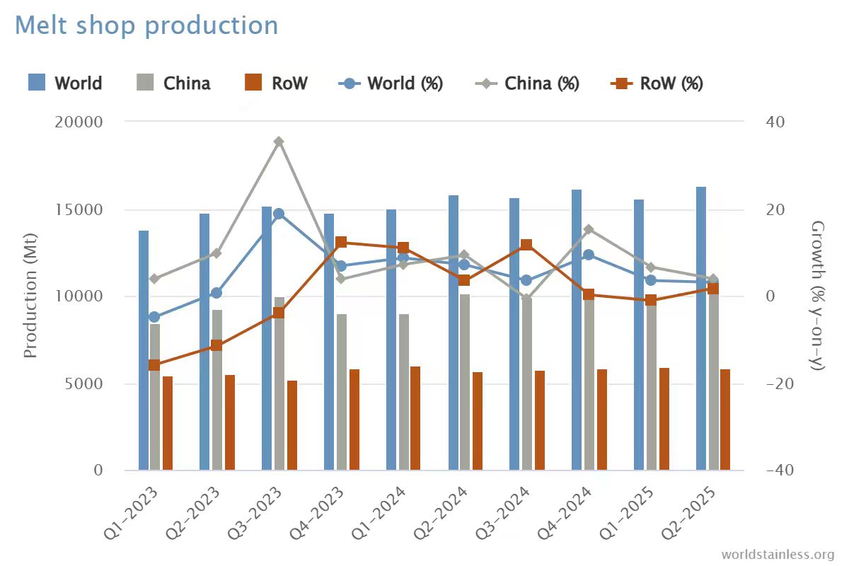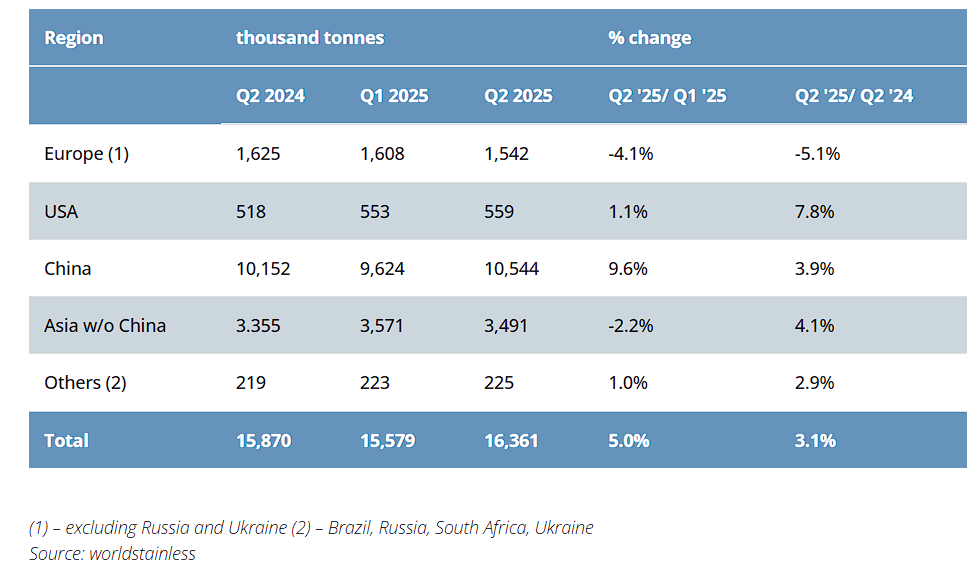 The World Stainless Association released global crude stainless steel output data for Q2 2025. Production totaled 16.361 million tons, up 3.1% year-on-year and 5% quarter-on-quarter.