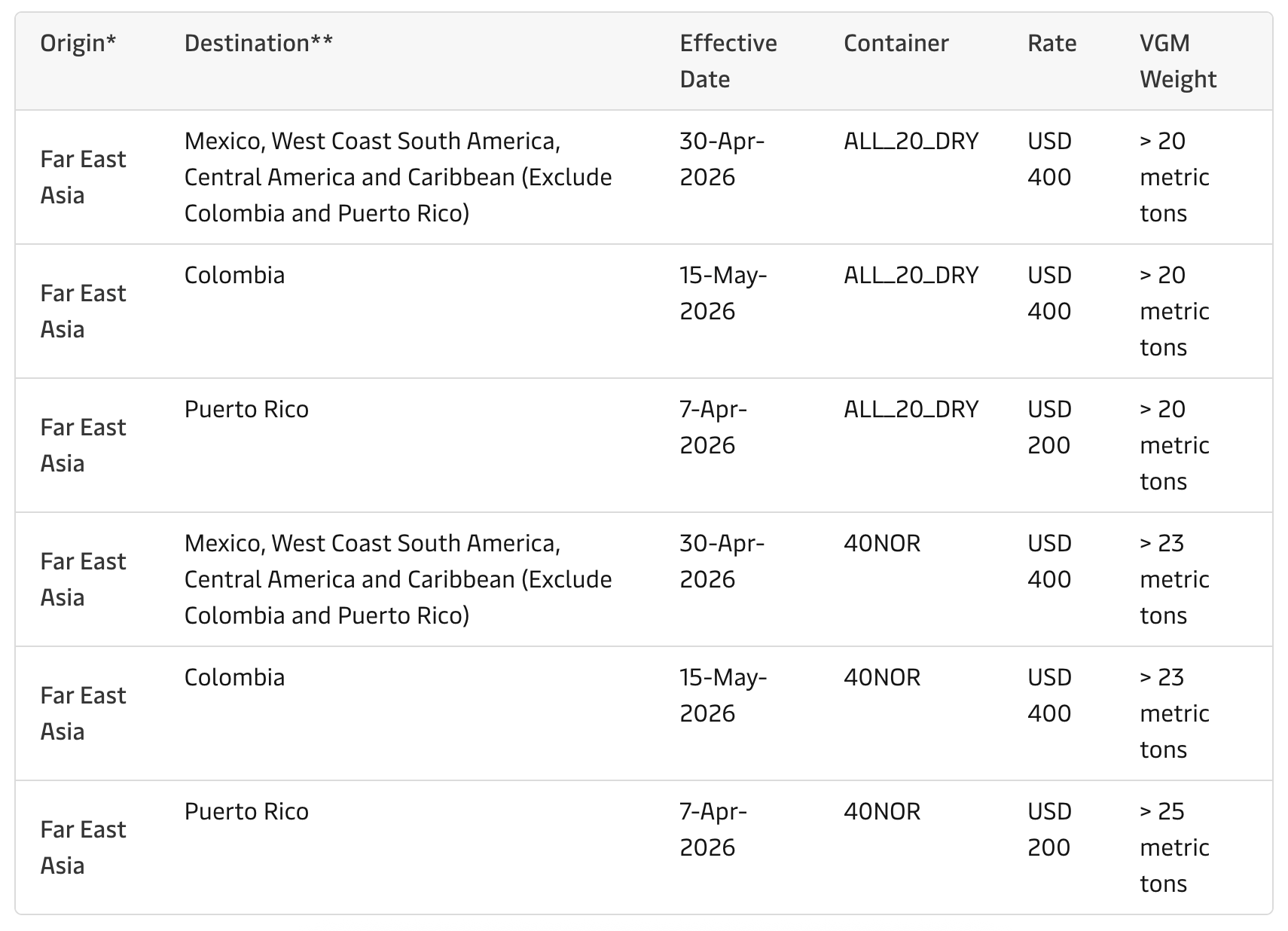Maersk will adjust the Heavy Weight Surcharge (HWS) for cargo traveling from Far East Asia to Mexico, the West Coast of South America, Central America, and the Caribbean (excluding Colombia and Puerto Rico). For all 20-foot dry containers with a Verified Gross Mass (VGM) exceeding 20 metric tons, and 40-foot non-operating reefers with a VGM exceeding 23 metric tons, the new standard for the heavy weight surcharge will be implemented, with a billing effective date of April 30, 2026.