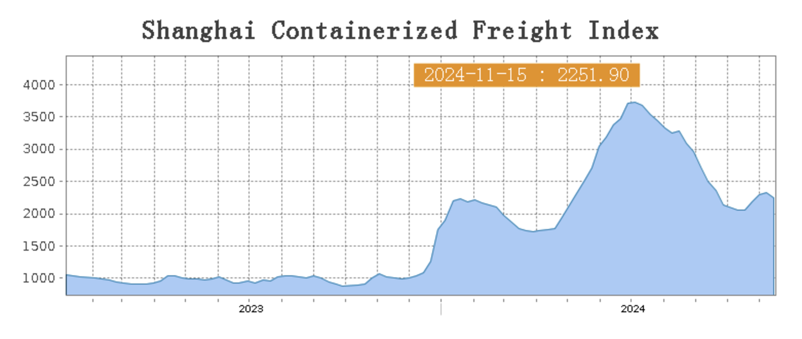 Last week, the Chinese export container transportation market experienced an adjustment, with transportation demand lacking further growth momentum, leading to a decline in freight rates on most routes and a decrease in the comprehensive index. On 15th November, the Shanghai Containerized Freight Index fell by 3.4% to 2251.90.
