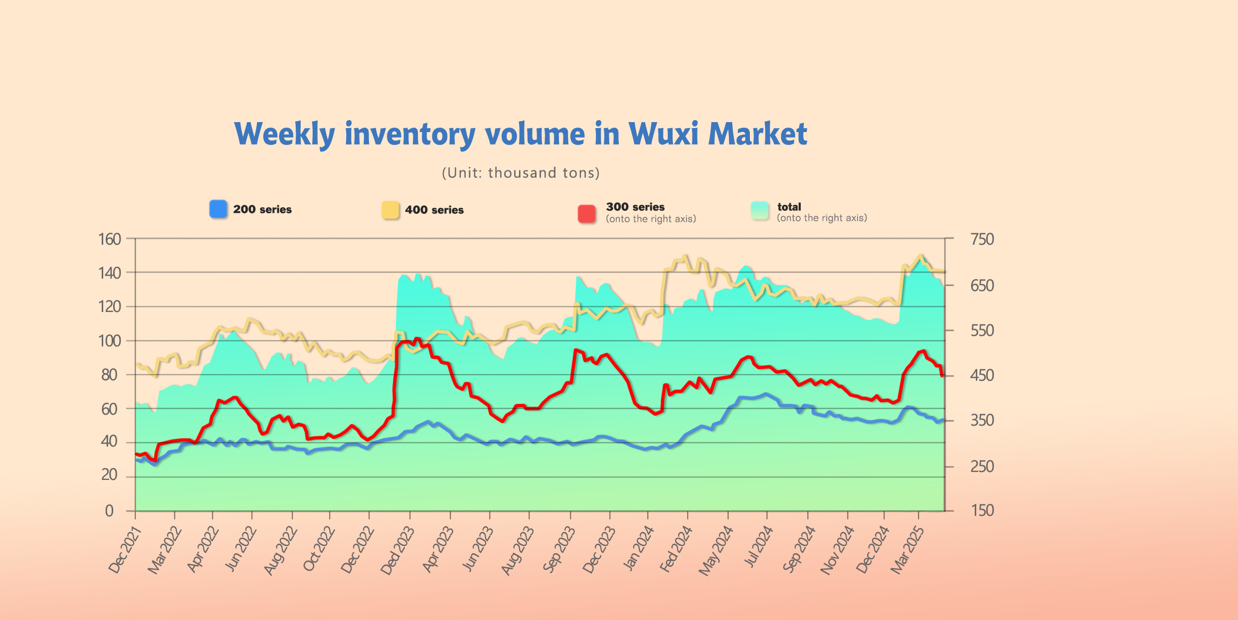 As of April 3rd, total inventory in Wuxi sample warehouses decreased by 22,044 tons to 633,833 tons. Breakdown: